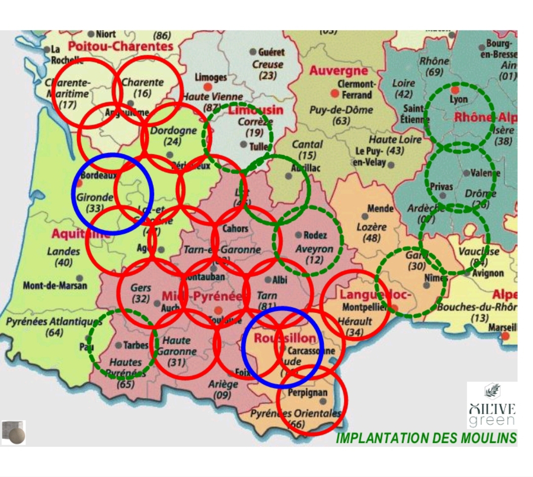 Vous pourrez voir sur la carte de France, les zones où seront implantées nos moulins.